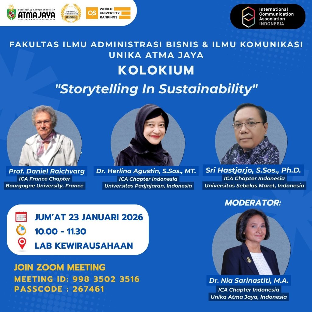 The Faculty of Business Administration and Communication Sciences, Universitas Katolik Indonesia (UNIKA) Atma Jaya, in collaboration with the International Communication Association (ICA) Indonesia Chapter, successfully held an international academic colloquium entitled “Storytelling in Sustainability” on Friday, 23 January 2026, from 10.00 to 11.30 WIB, at the Entrepreneurship Laboratory (Lab Kewirausahaan) and via Zoom.